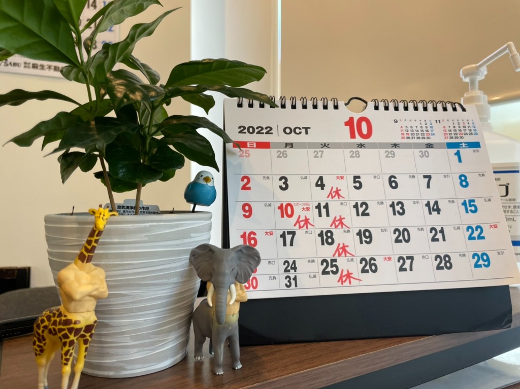 本日より10月がスタート!今年も残り3ヶ月になりましたね!日中と朝晩の温度差が少しづつ大きくなってきましたが体調はいかがでしょうか?体調管理をしっかりおこない残り無理のない生活をしていきましょう!今月は定休日に加えスポーツの日がお休みになります♪10月4日10月10日10月11日10月18日10月25日になります。よろしくお願いします