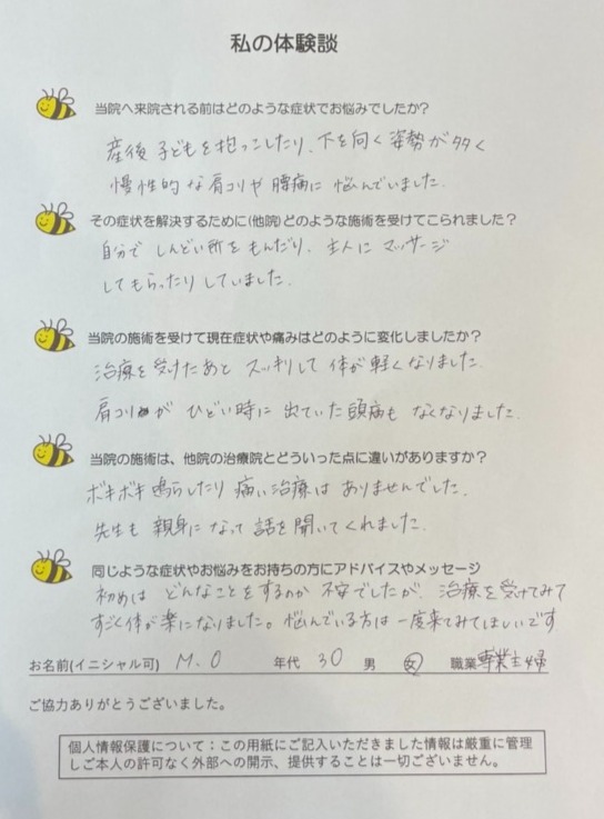 A.産後子供を抱っこしたり、下を向く姿勢が多く慢性的な肩こりや腰痛に悩んでいました。。