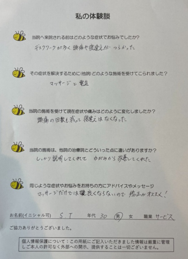Sさんは特に頭痛がひどく頭痛薬が手放せない状態でしたか今では頭痛薬をほとんど飲まなく手もいい状態に改善しました。